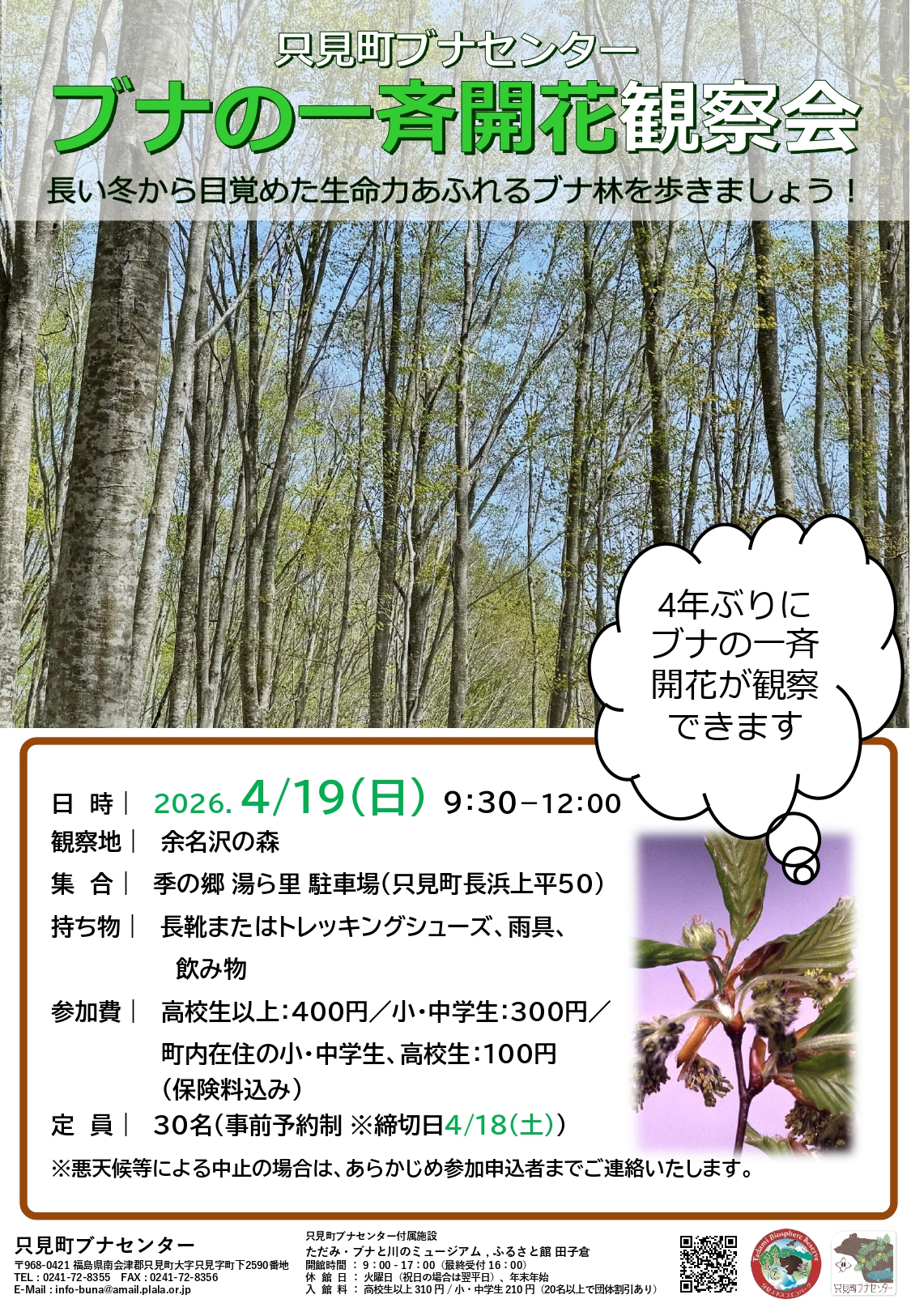 只見町ブナセンターでは4月19日に自然観察会「ブナの一斉開花観察会」を下記のとおり開催いたします。