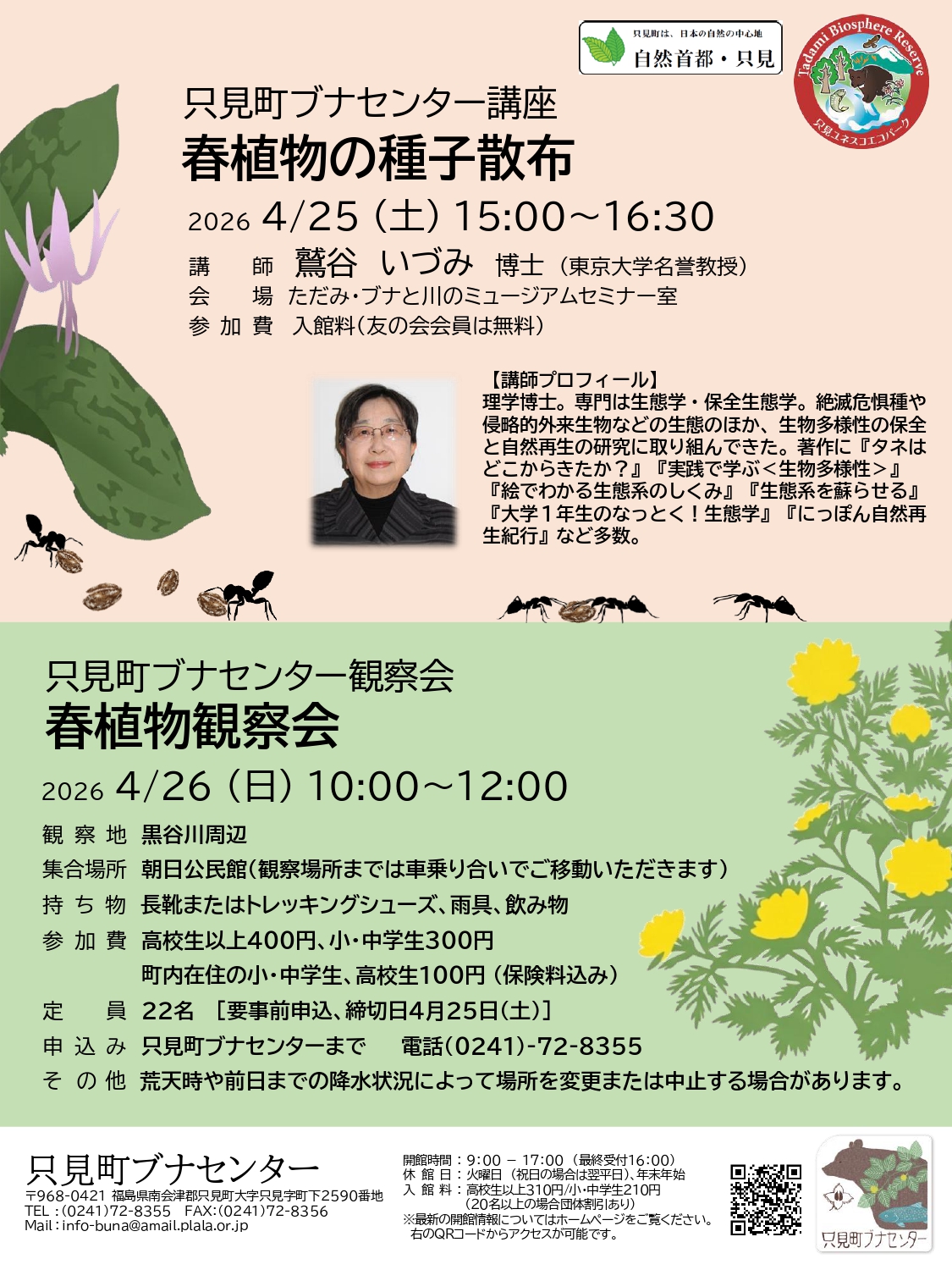 只見町ブナセンターでは4月25日にブナセンター講座「春植物の種子散布」を、26日に自然観察会「春植物観察会」を下記のとおり開催いたします。